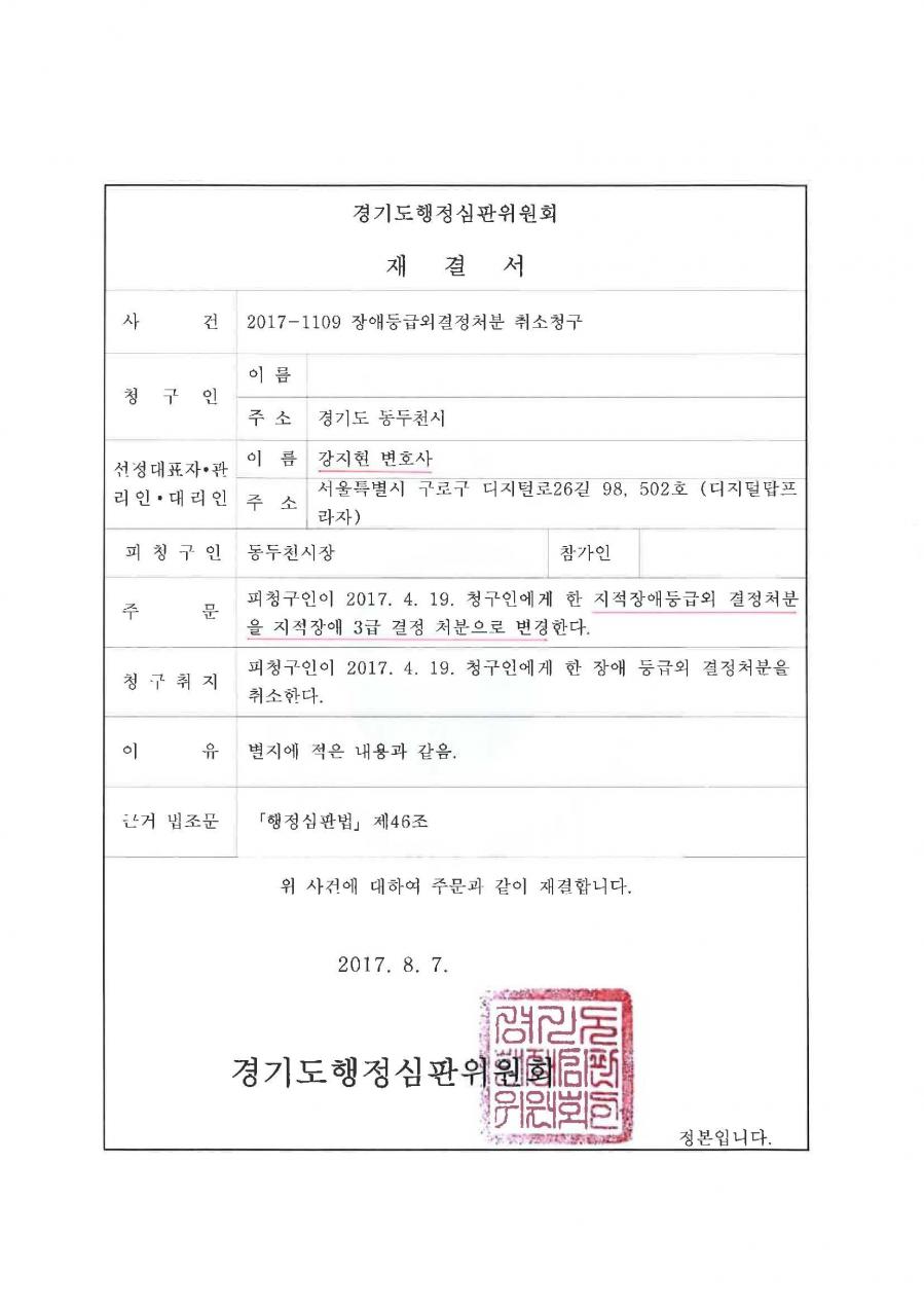 - 사건 : 경기도행정심판위원회 2017-1109 장애등급외결정처분 취소청구