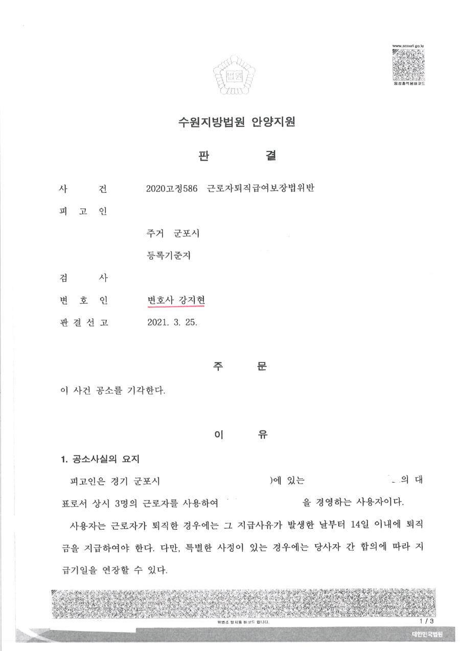 - 사건 : 수원지방법원 안양지원 2020고정586 근로자퇴직급여보장법위반