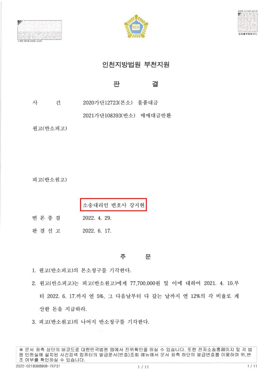 - 사건 : 인천지방법원 부천지원 2020가단12723(본소) 물품대금