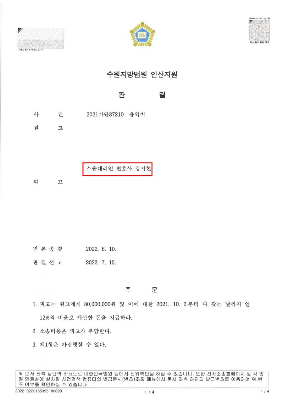 - 사건 : 수원지방법원 안산지원 2021가단87210 용역비