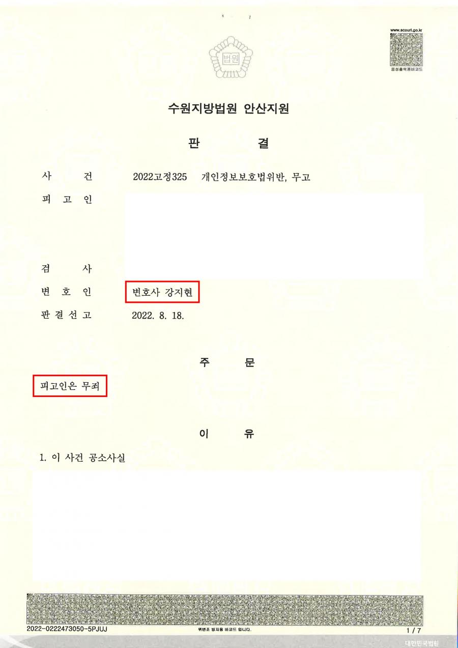 - 사건 : 수원지방법원 안산지워 2022고정325 개인정보보호법위반, 무고